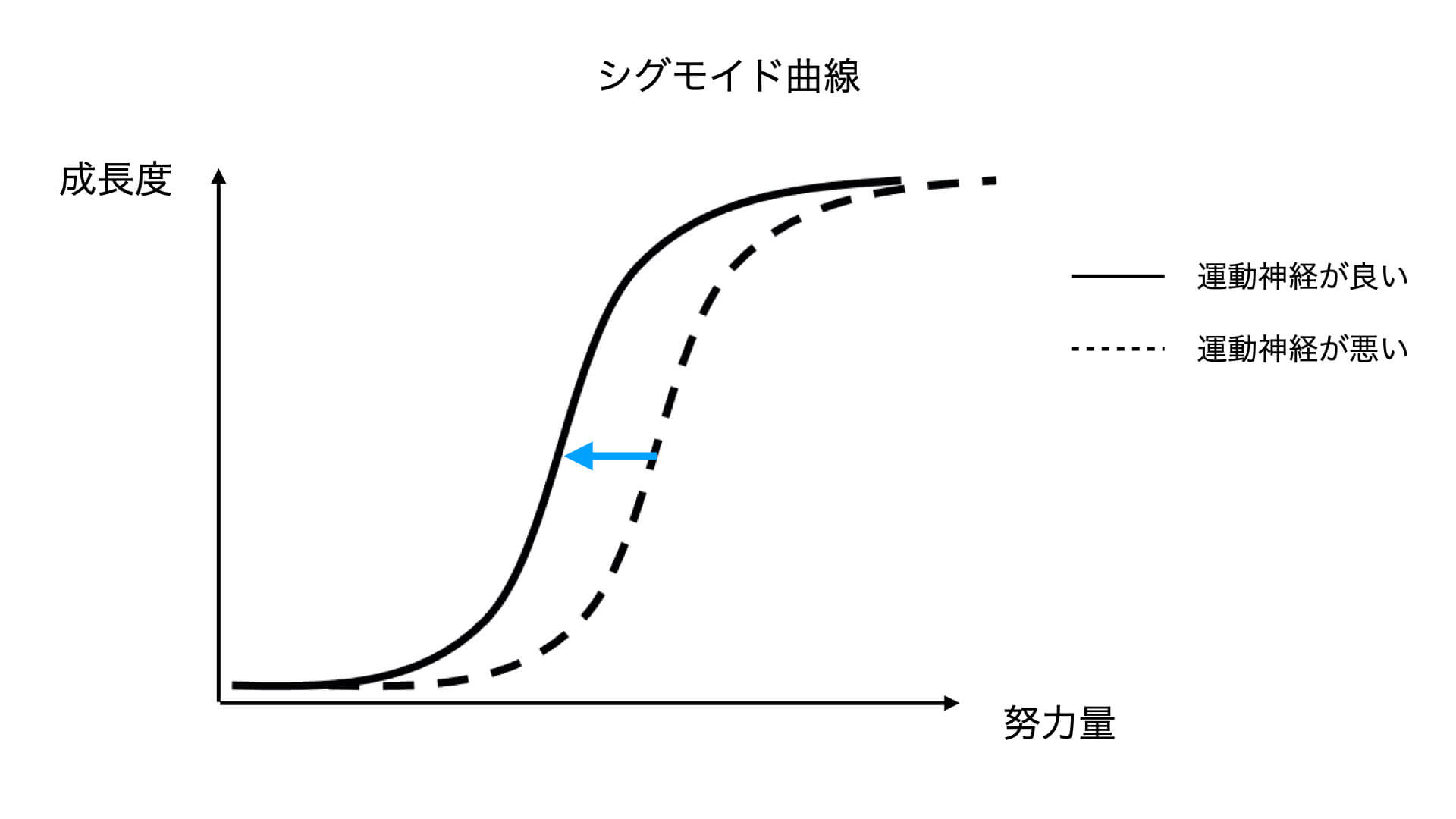 ・動作を覚える(正しい身体の使い方になる)ことは曲線上の成長線(シグモイド曲線)
