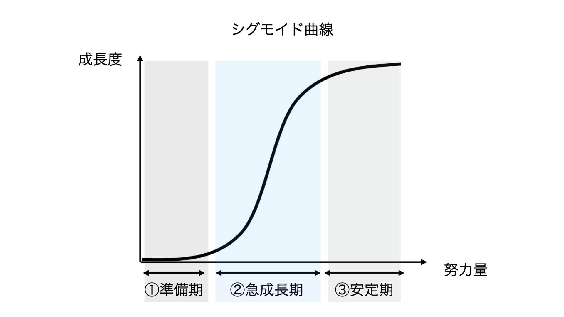 この成長曲線はなかなか成長しない①準備期間、急成長する②急成長期、安定する③安定期に分類されます。
