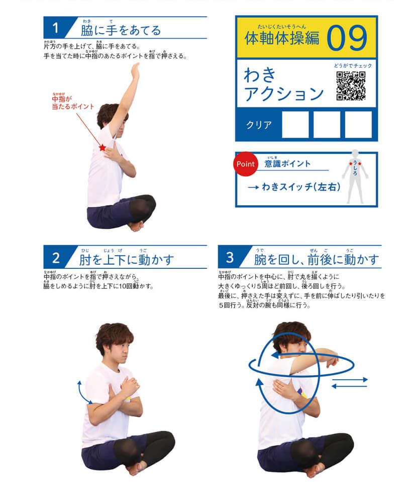 肩の固定を改善するためには、「わきスイッチ」を使うよ!次の体操でわきポイントを整えてみよう!