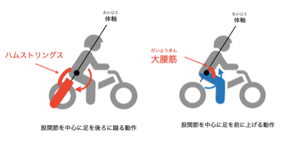 ランニングバイクはサドルに座り、ハンドルを握ることは自転車と同じですが、一番の違いはペダルがないことです。そのため地面に足がつき、サドルに座り、ハンドルを握る姿勢が前傾姿勢となり、股関節を中心に動かすため大腰筋やハムストリングスといった筋肉が鍛えられます。
