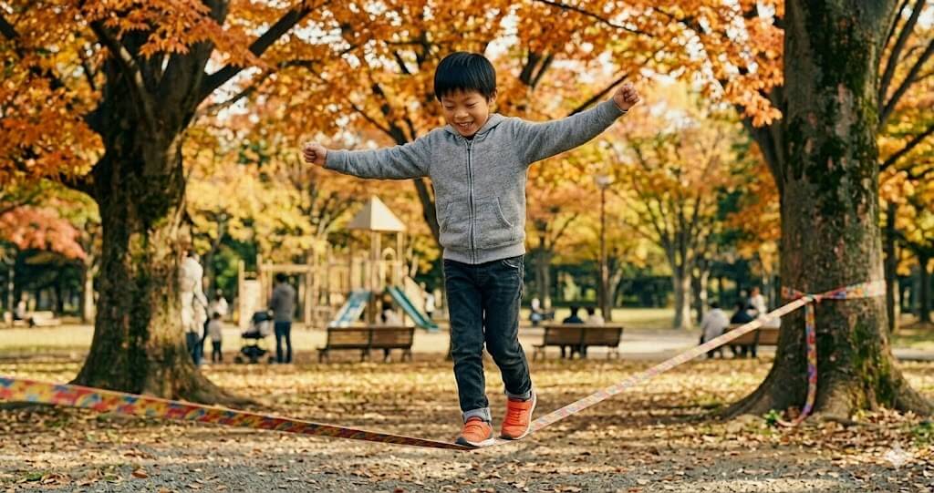 キャンプなどでも木と木の間にラインを張って、すぐに遊ぶことができます。最初はラインの上をバランスをとりながら歩くところから始めましょう。なかなかバランスを取るのが難しいけど、その分バランス能力が高まること間違いなし!