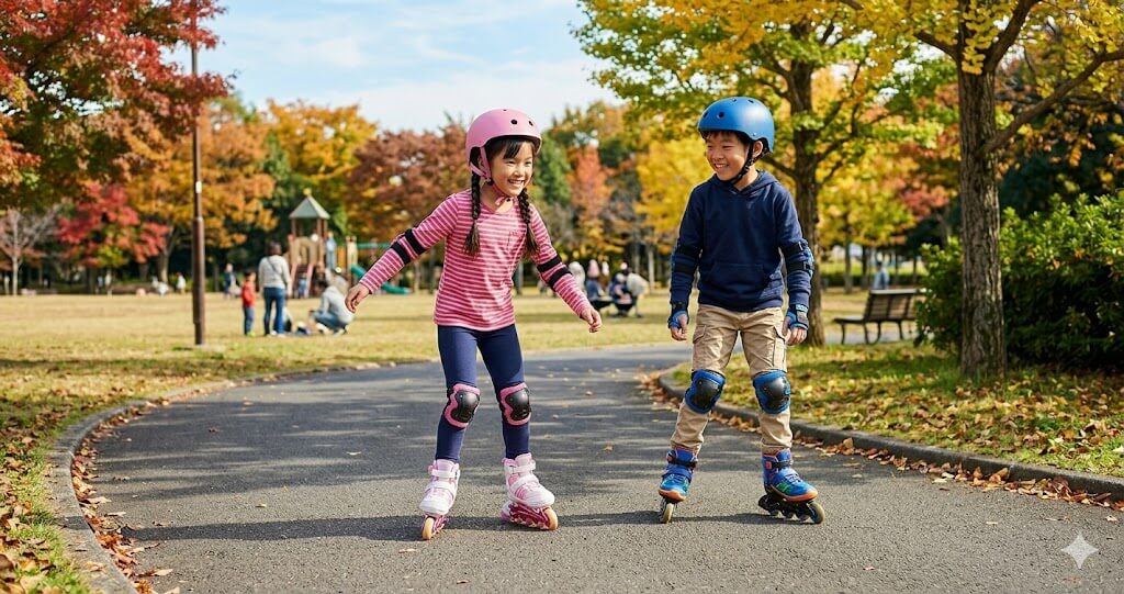 インラインスケートとは、タイヤが縦一列に並んだスケート靴を履いて地面を滑る遊びです。アイススケートの陸上版のようなイメージで、スピード感と自由な操作性が魅力な遊びです。