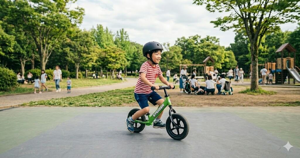 これに乗れるようになっていると、自転車に乗る時もびっくりするぐらいすぐに乗れてしまいますよ!本当におすすめの遊びです!