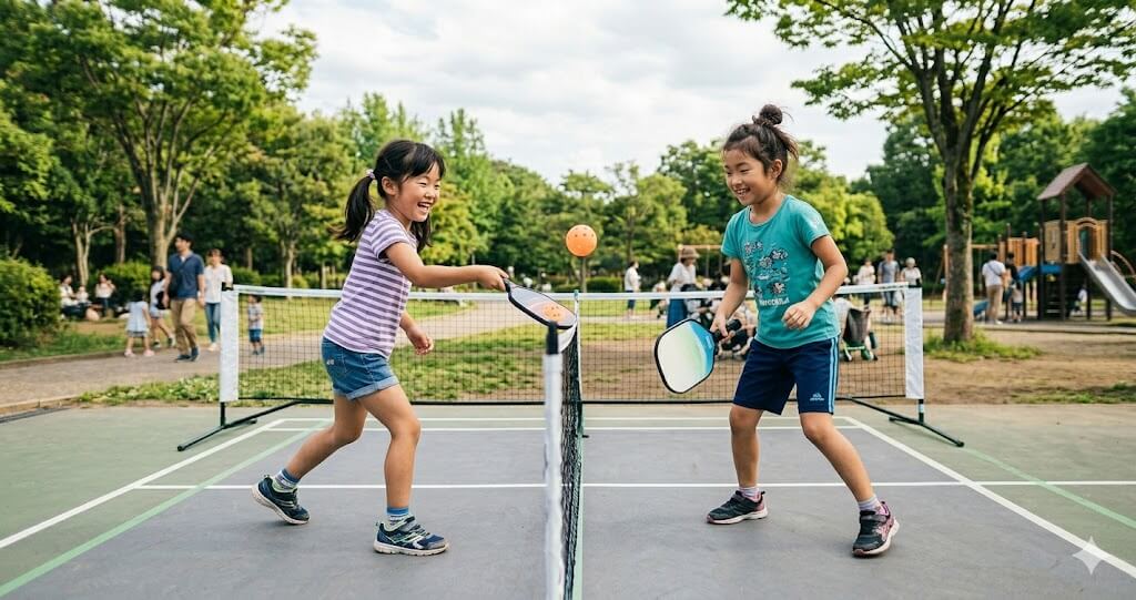 ピックルボールとは、テニス・バドミントン・卓球の要素を組み合わせた、今世界中で急速に人気が高まっているラケットスポーツです。専用のラケット、穴の開いたボールを使用し、小さなスペース(テニスコートの1/3)でできるため公園などでもやりやすく、おすすめのスポーツです。