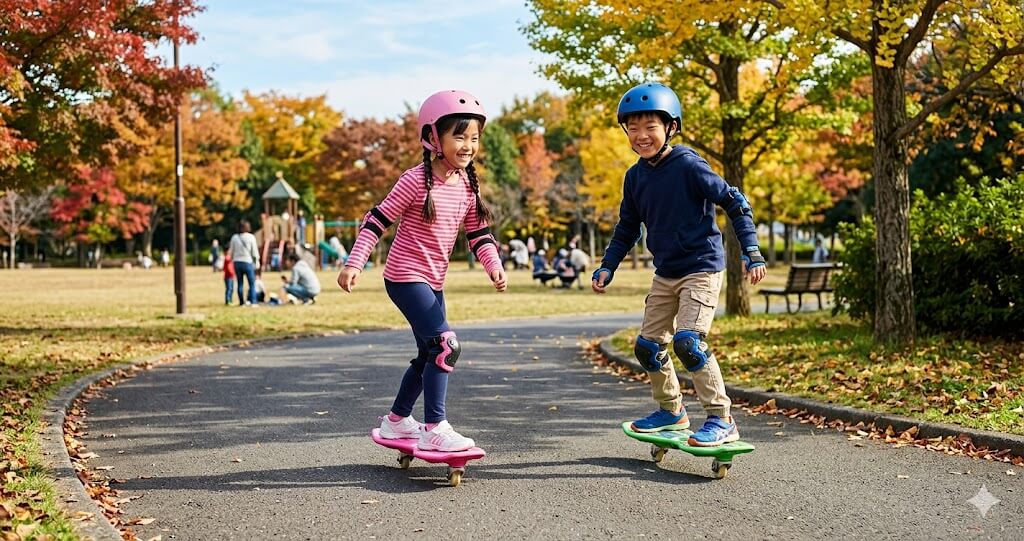前後の2枚のボードが1本のパイプで繋がっており、それぞれが独立して左右に傾く構造です。地面を蹴って進むのではなく、身体を前後にひねる独特の動きで進みます。この「ひねり」の連動が、スポーツにおいて非常に重要な「連結能力」を育てます。リズム良く動かないと進まないため、体全体でテンポを刻む感覚が身につきます。