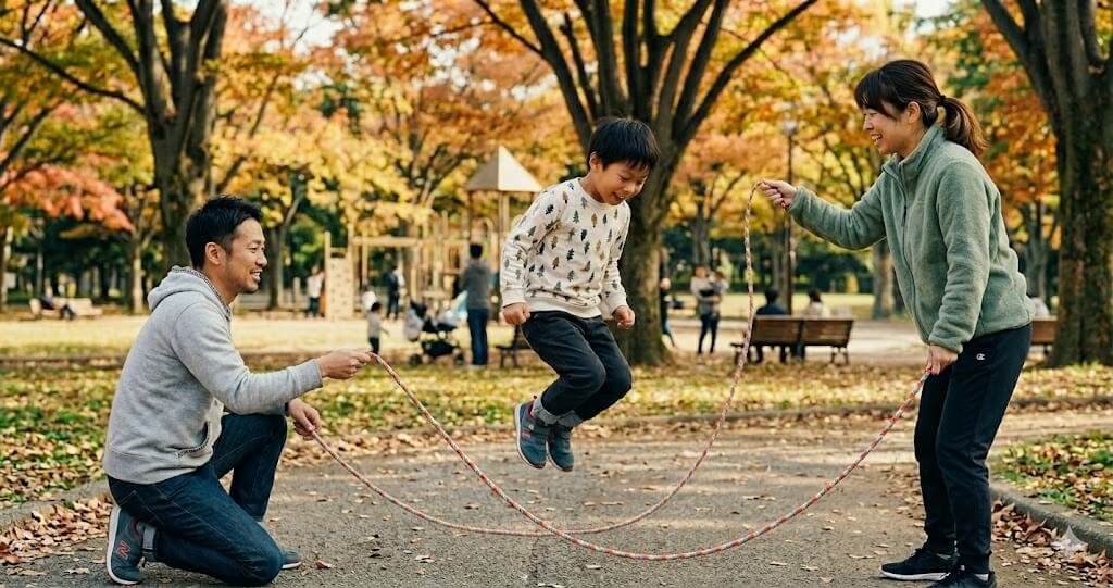 ダブルダッチとは、2本の縄を使って跳ぶ縄跳び競技です。向かい合った2人が右手と左手に縄を持ち、交互に内側に回し、その中をリズムよく跳びます。2本の縄の回転に合わせて飛び込むため、高度な「リズム能力」と「反応能力」が求められます。縄の動きを読み、自分の体をそのリズムにシンクロさせる経験は、球技やダンスにも直結します。
